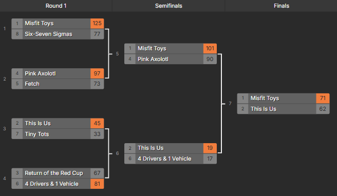 Misfit Toys would move to the finals bracket undefeated. This Is Us moved to the finals after defeating 4 Drivers & 1 Vehicle. Misfit Toys then continued their undefeated streak to become the champions.