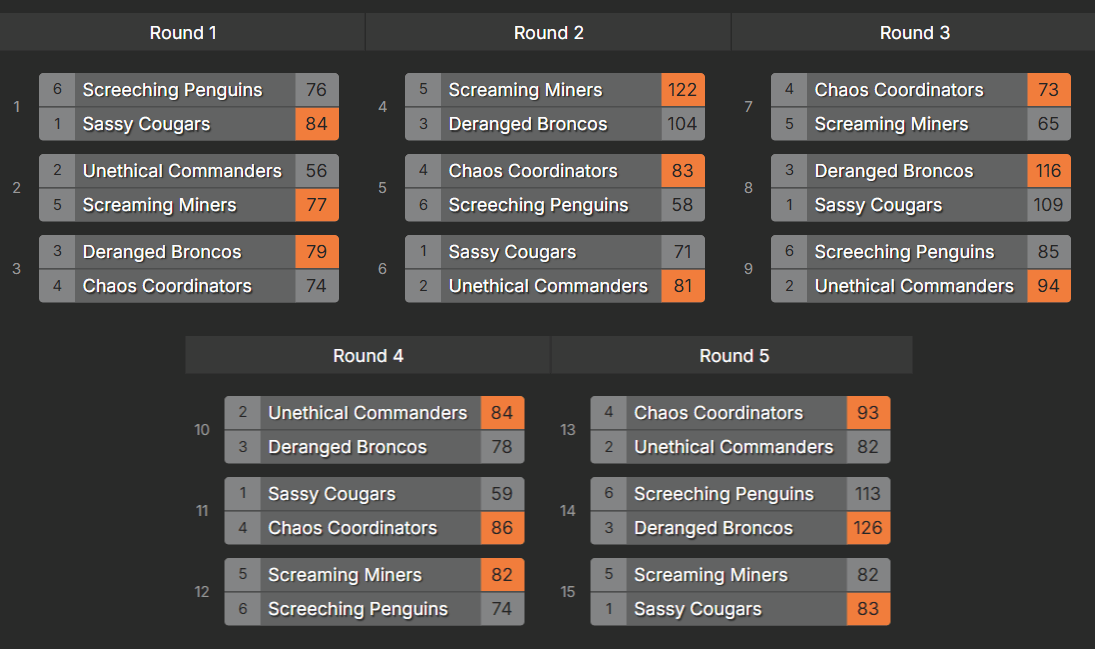 Congratulations to all the players of Misfit Toys: Ninja Master, Rye Guy, Hot Topic, Woodpile, Sanchez.