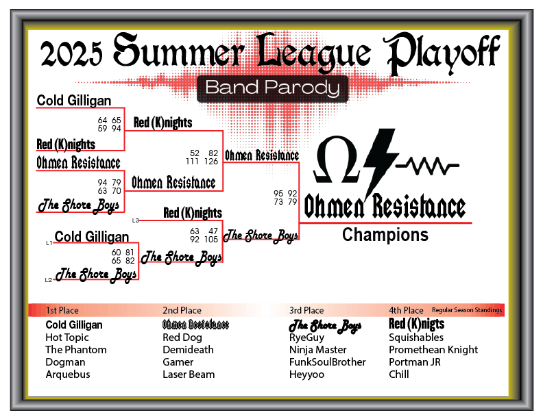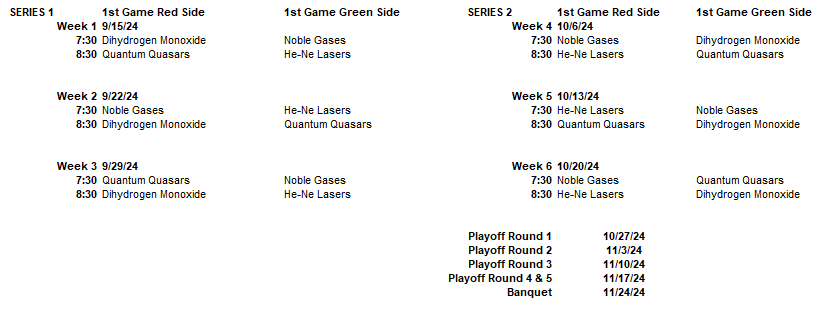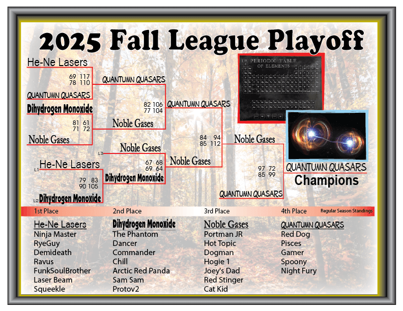 The Winter League is now forming. This league will consists of 3 round robin series. The round robin games will be used to seed the double elimination tournament that will determine the Winter League Champions.